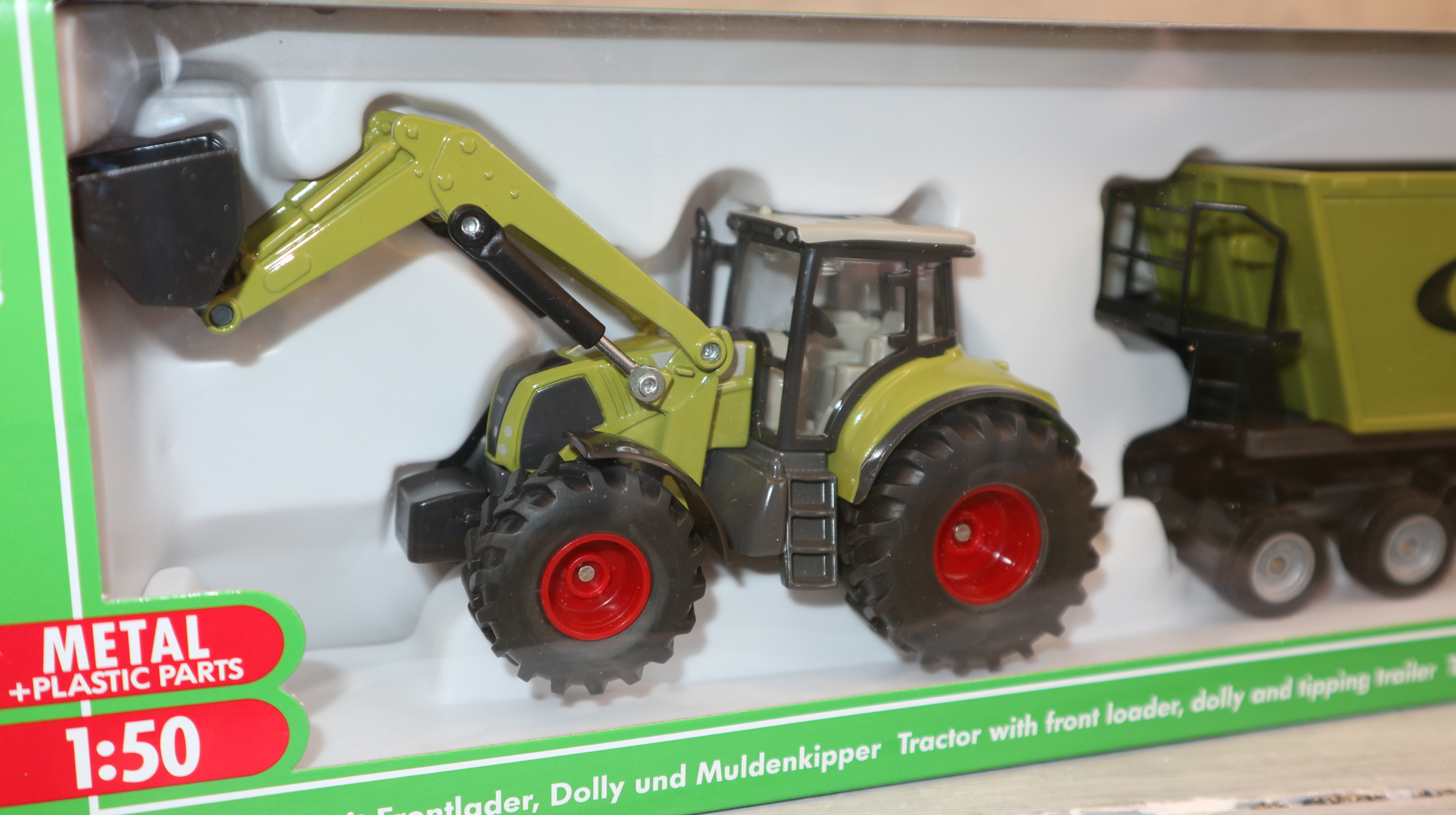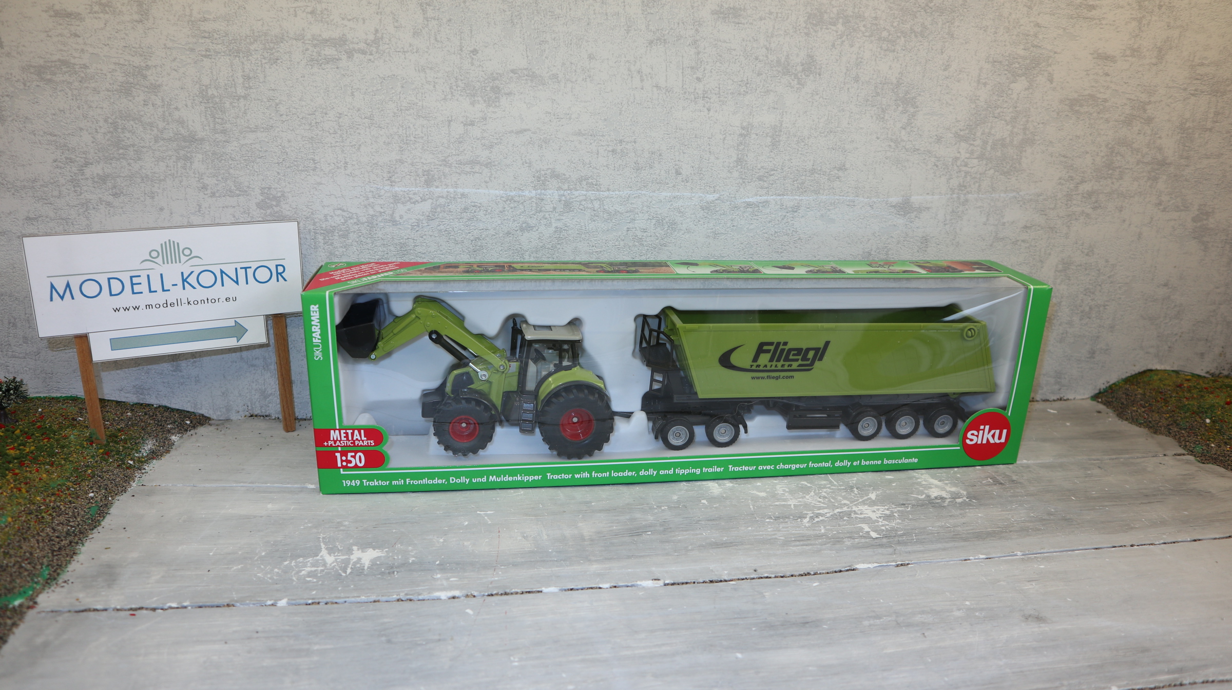Produktinformationen "Siku 1949 in 1:50, Claas Arion mit Frontlader, Dolly und Muldenkipper, Neu in OVP"